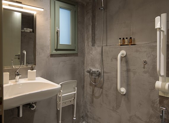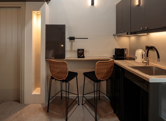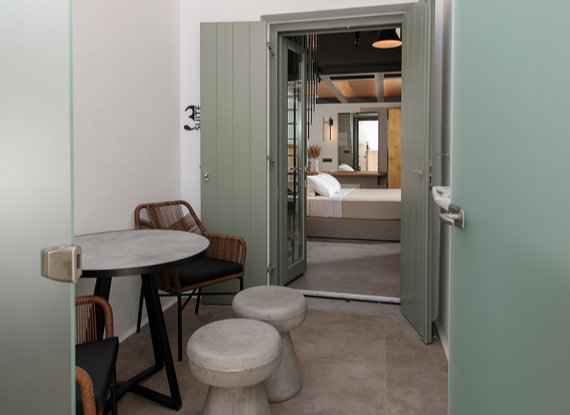 This spacious type of suite can comfortably accommodate 4 persons and is located at the ground floor with its own entrance and patio. The open attic offers a separate bedroom with a double bed and ensuite bathroom and there is one more double bed in the entrance. The suite, also features a kitchenette with cooking rings & refrigerator, air-conditioning, satellite TV and a one more spacious bathroom with shower.
