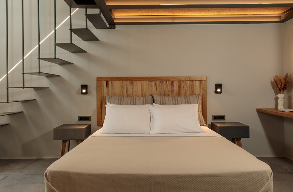 This spacious type of suite can comfortably accommodate 4 persons and is located at the ground floor with its own entrance and patio. The open attic offers a separate bedroom with a double bed and ensuite bathroom and there is one more double bed in the entrance. The suite, also features a kitchenette with cooking rings & refrigerator, air-conditioning, satellite TV and a one more spacious bathroom with shower.